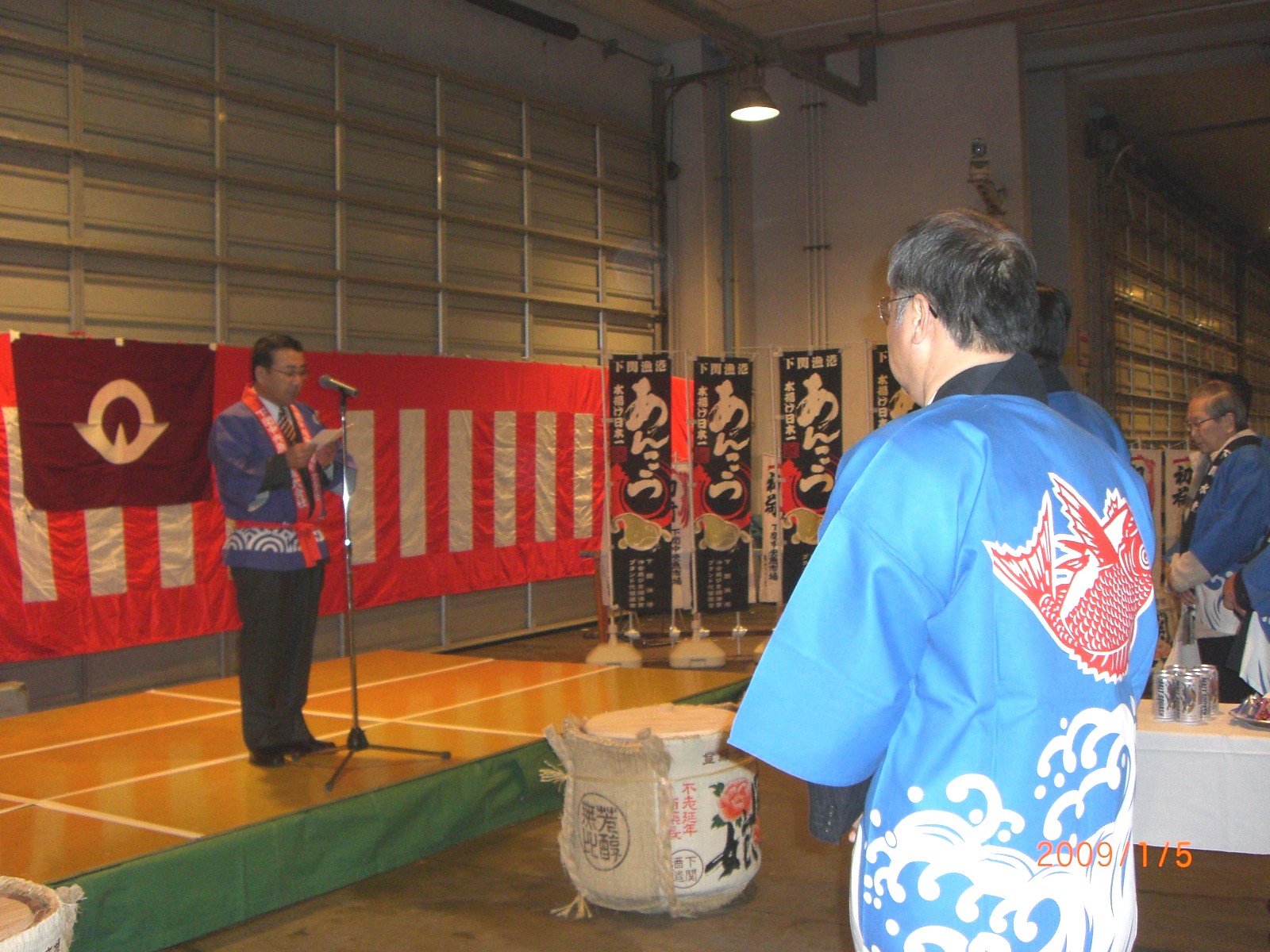 午前0時30分より大和町市場の初せりの開始式に参列しました。中央魚市木原社長の挨拶に始まり、来賓挨拶・紹介の後、唐戸魚市松村社長の三本締めでしめくくりました。挨拶の中で、沖合い底引き漁業も基本とする現市場は、あんこうに加え≪あかムツ≫等のブランド化を目指しています。又、インドネシアからの漁業研修者の受け入れなど積極的に取り組みたい。」等抱負が述られました。