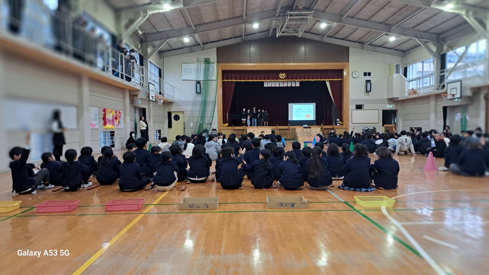 3月6日名陵学園 名陵小学校では一時限目に今春卒業となる六年生を送る会が体育館で開催され、当方も冒頭30分参列させて頂きました。事前に六年生にヒアリングを行い、それをもとに参加生徒(1~5年生)へクイズが出され、回答が当った時は大歓声でした。因みに『大好きだった給食メニュー?』は『カレーライス』、『春夏秋冬 好きな季節は?』には『秋』、『一番の思い出は』は『修学旅行』といった具合。次に一年生が、贈る言葉とダンスを披露しました。