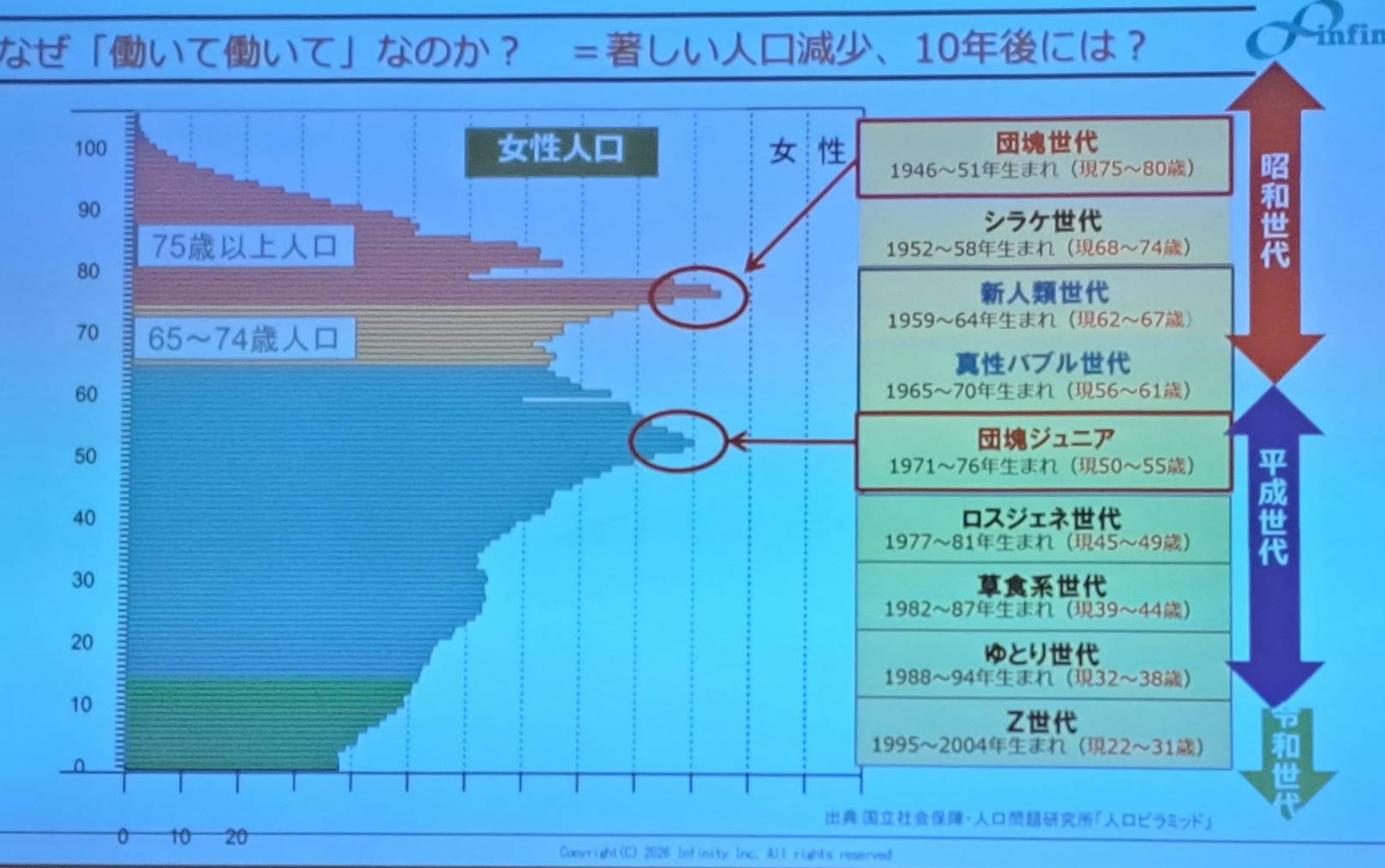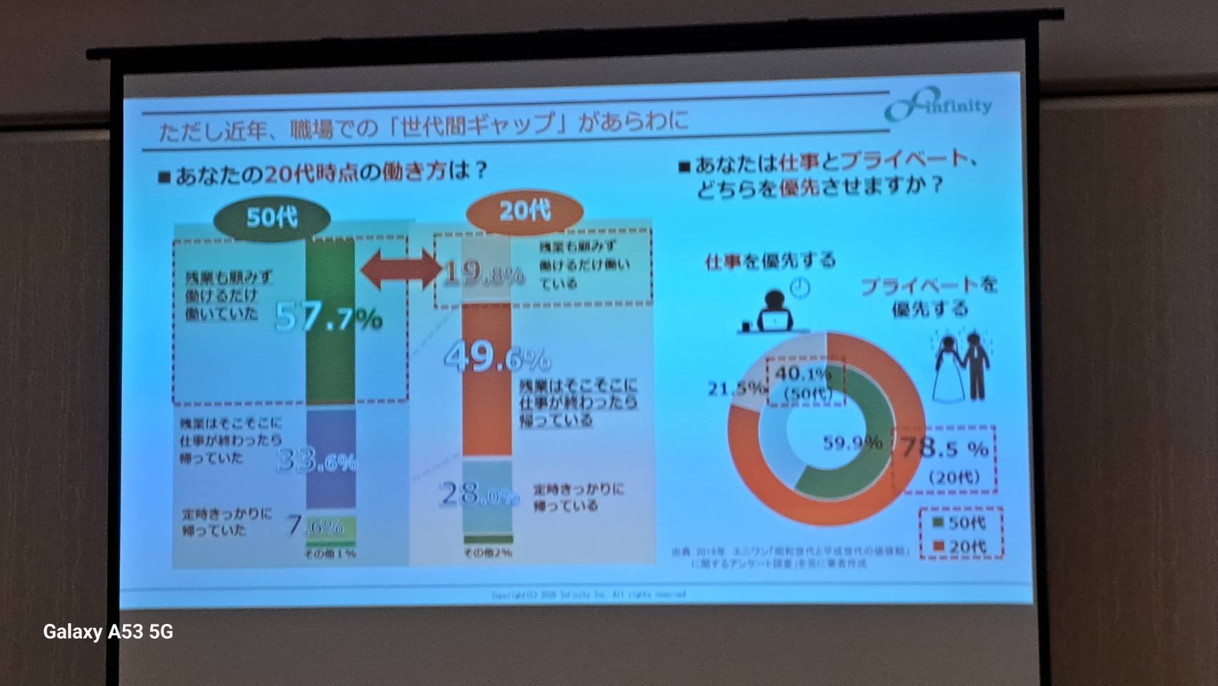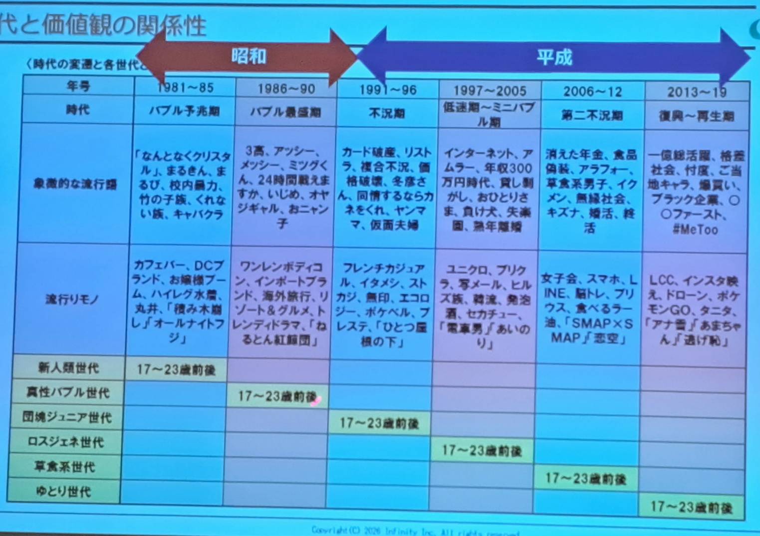 就職氷河期の影響を受けた世代への配慮が課題の一つですが、ロスジェネ世代~Z世代迄のそれぞれの世代の皆様の考え方や嗜好等仕事を通して得た分析も含めて大変興味深いお話でした。